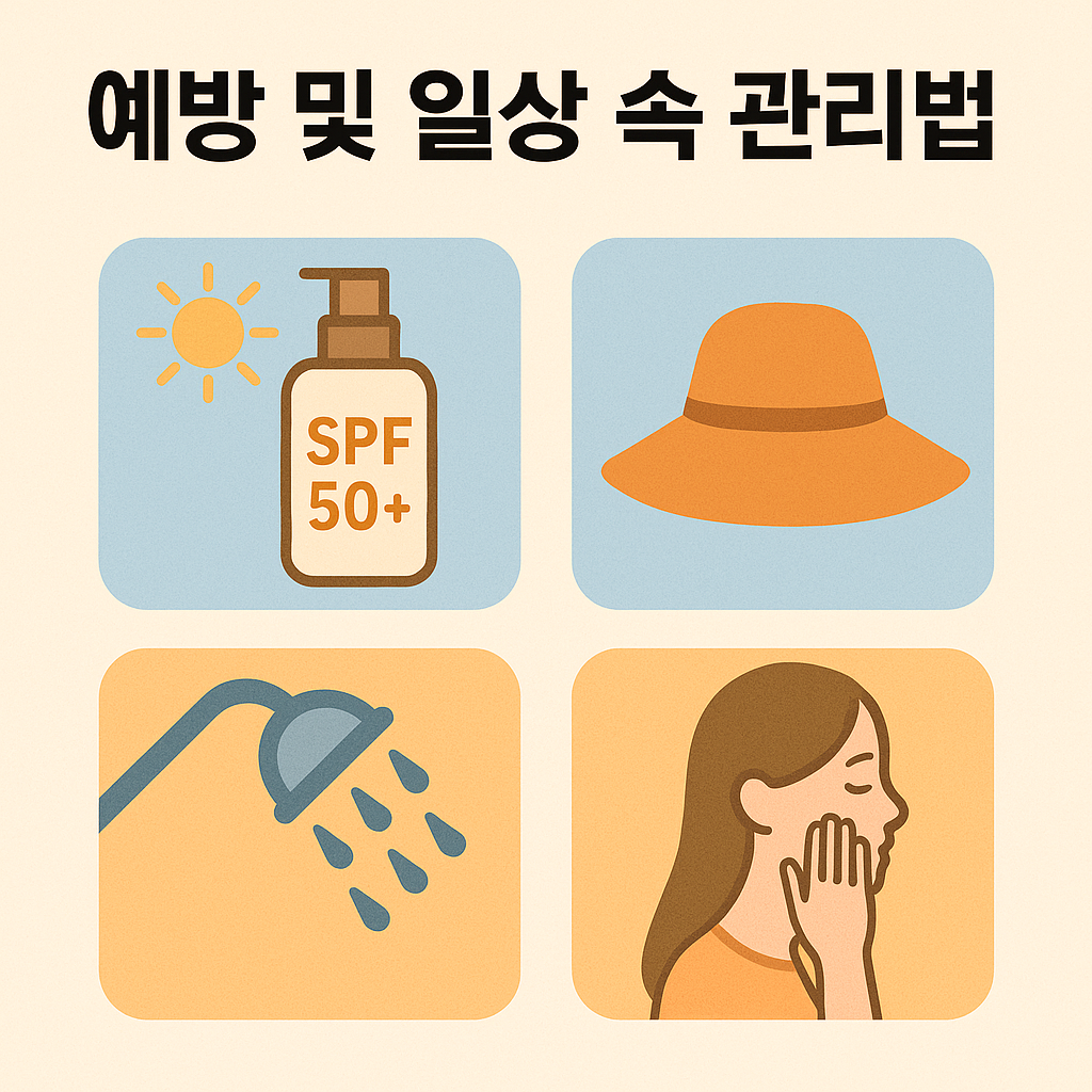 자외선 노출을 줄이는 것이 가장 중요합니다. 긴팔 옷과 모자 착용, 자외선 차단제 사용, 오전 10시~오후 3시 외 활동 등이 예방에 도움이 됩니다. 또한 보습과 피부 진정 성분이 함유된 화장품을 꾸준히 사용하는 것도 효과적입니다.